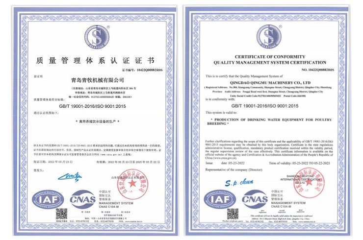 青島青牧機械有限公司成立于2013年,是一家集研發(fā)、生產(chǎn)、銷售、服務于一體的綜合性企業(yè)。公司專注于家禽飲水設備的研發(fā)和生產(chǎn),擁有專業(yè)的研發(fā)團隊、先進的加工設備以及自動化組裝線,力求打造“簡單、高效、環(huán)保”的高端禽用飲水系統(tǒng)。